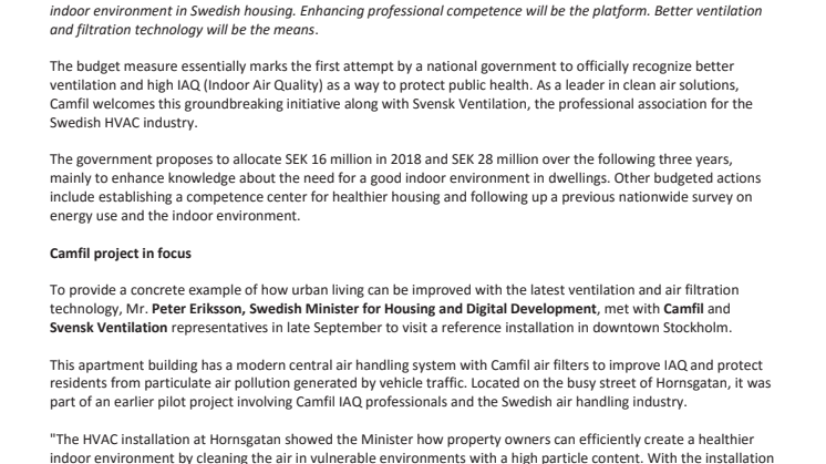 • Swedish government takes historical steps to improve residential living with better ventilation and filtration solutions